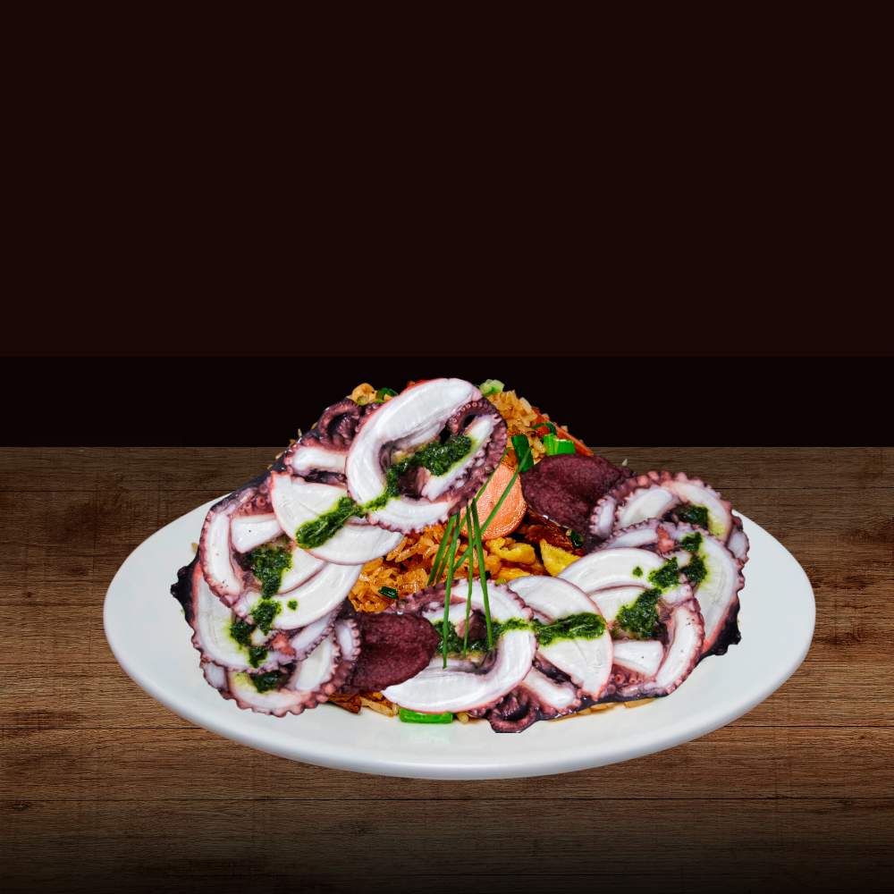Un plato que combina pulpo fresco y tierno con arroz perfectamente cocido, sazonado con una mezcla de especias que resaltan los sabores marinos. Cada bocado es una explosión de sabores auténticos que te transportarán al corazón del océano.